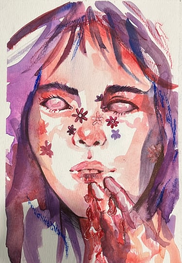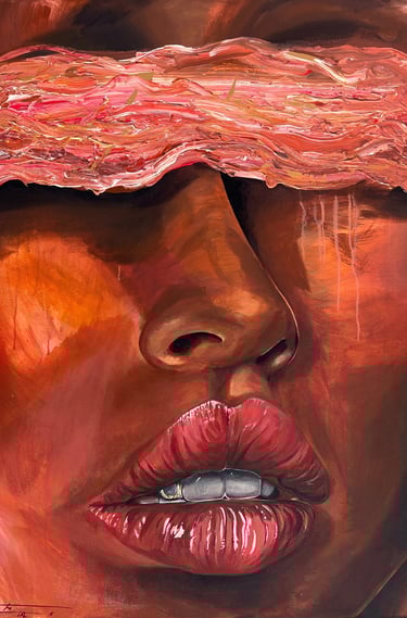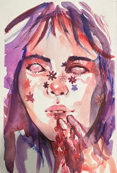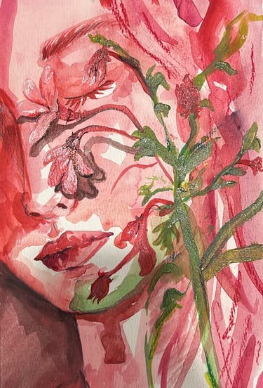 El detrimento que sufren las flores una vez cortadas se convierte en el objetivo fundamental de mi obra .Este daño al proceso natural de crecimiento lo comparo con la separación familiar y el inicio de una nueva etapa alejado de mis raíces .Los ramos situados en los ojos aluden a la marchitez de las miradas, portadoras de sentimientos encontrados, que hablan a través de la distancia migratoria donde el duelo hogareño queda detrás de las pantallas .Una vez comienzan a perder su vigor y los pétalos carecen de fuerza para sostenerse, se muestra entre tanta tristeza aquellos ojos abastecidos de palabras, impactándose contra el suelo sus delicados pistilos portadores de una nueva vida, que van a seguir la ardua faena de procrearse.
