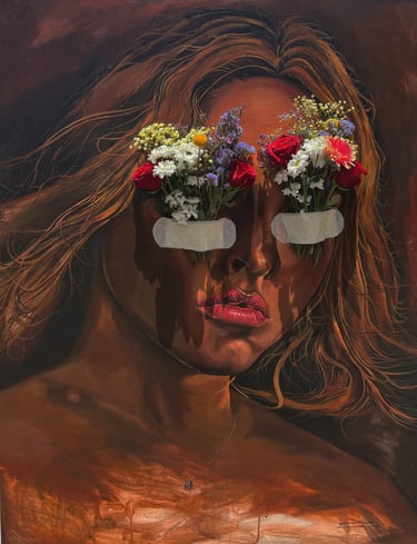 El detrimento que sufren las flores una vez cortadas se convierte en el objetivo fundamental de mi obra .Este daño al proceso natural de crecimiento lo comparo con la separación familiar y el inicio de una nueva etapa alejado de mis raíces .Los ramos situados en los ojos aluden a la marchitez de las miradas, portadoras de sentimientos encontrados, que hablan a través de la distancia migratoria donde el duelo hogareño queda detrás de las pantallas .Una vez comienzan a perder su vigor y los pétalos carecen de fuerza para sostenerse, se muestra entre tanta tristeza aquellos ojos abastecidos de palabras, impactándose contra el suelo sus delicados pistilos portadores de una nueva vida, que van a seguir la ardua faena de procrearse.